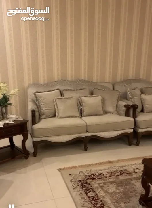 الطقم عبارة 4 قطع ( 2 مفرد- 1 كنب شخصين -1 يشيل 3 او 4 اشخاص ) مع طاولتين جانبيه وطاولة وسط نظيف جداً كالجديد استعمال جداً خفيف ونظيف بحالة فوق الممتازه