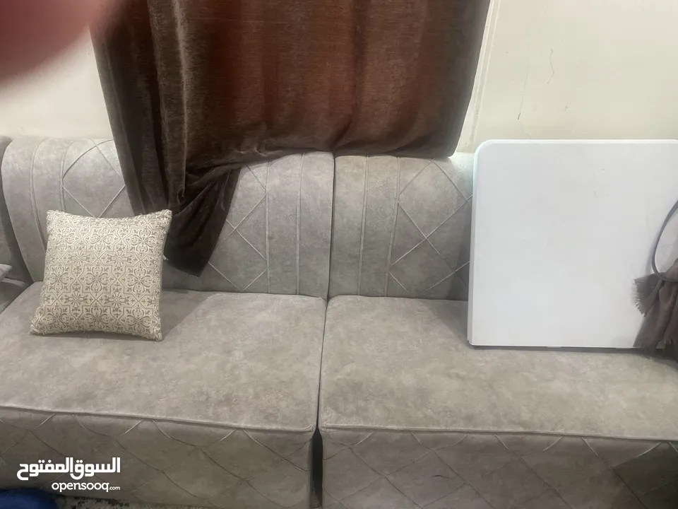 للبيع اثاث انتريه ( 3 كنبات وكرسيين )في حالة الجديد ومكتب للدراسة وطاولة كبيرة وسجادة 4*5 تركي مستعملين في حالة الجديد